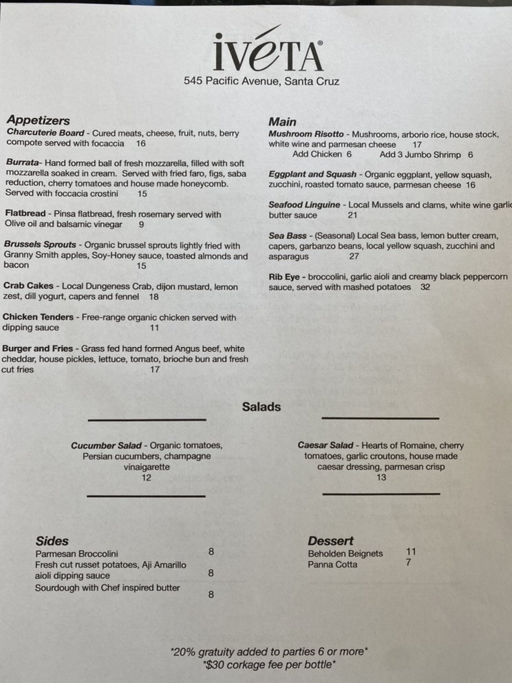 Welcome to Iveta - Downtown, a culinary gem nestled in the heart of Santa Cruz. This intimate and upscale Italian eatery specializes in mouthwatering dishes and delectable desserts, making it perfect for breakfast, brunch, or a cozy dinner. With a menu that elevates Italian classics, guests rave about the exceptional tortellini, brussels sprouts, and the delightful burrata salad topped with honey and seasonal fruits.